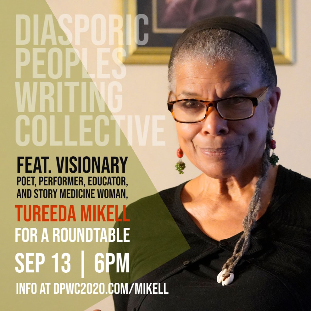 The Diasporic Peoples Writing Collective (DPWC) will host the fabulous Tureeda Mikell on Zoom, September 13, 6PM, PST. This one hour event is open to DPWC members, dreamers, and lovers of lit art.