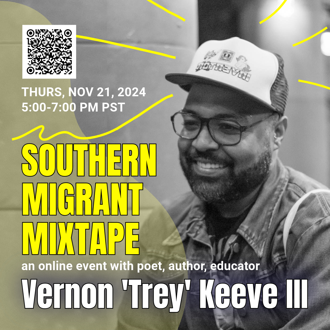 This event is on Thursday, November 21, 2024, 5:00-7:00PM PST, on Zoom. For our give-away, the first 10 folks to participate in our online Q&A will be gifted a copy of Southern Migrant Mixtape.